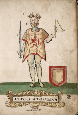 Image credits (top to bottom, left to right): Royal Banner of Scotland; John Balliol, King of Scotland [r. 1292-1296] (from “Music for Allan Ramsay’s Collection, 1725” in Britain Magazine online); Robert Bruce, King of Scotland [r. 1306-1329] (stipple engraving by Henry Hoppner Meyer, 1806); Plantagenet Arms of Edward I, II, and III of England; Edward I, King of England [r. 1272-1307] (Painting on wood by unknown author at Westminster Abbey, photographed by Angelo Hornak, in Britain Magazine online 2 Aug 2017); Edward II, King of England [r. 1307-1327] and his “favorite,” Piers Gaveston (Painting by Marcus Stone, 1872); Battle scene of the First Scottish War of Independence as envisioned by a modern artist, from Quizz Club; Declaration of Arbroath.